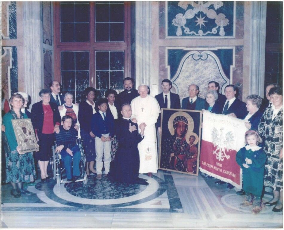 Father Saxon was accompanied by fourteen members of the parish family to Rome to present the Icon of Our Lady to Pope John Paul II. They were received in a private audience on December 12, 1990. It was the feast of Our Lady of Guadalupe. Our Holy Father, blessed the image of Our Lady and extended his Apostolic Blessing to the entire parish. Every Wednesday evening following the sacrament of reconciliation and the rosary, Father Saxon leads all who gather in a special novena, which is followed by the celebration of the eucharist. Our Blessed Lady has poured abundant blessings upon our parish and we hold a special place of love and affection for her in our hearts.
