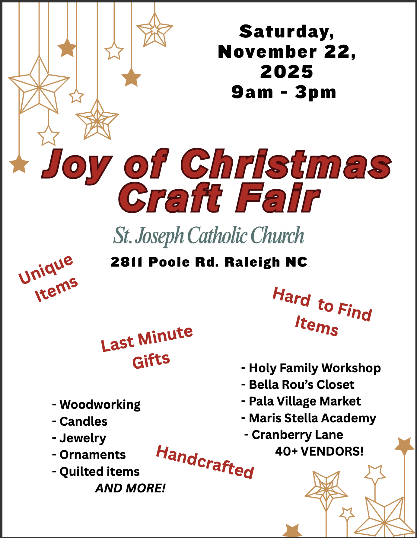St Joseph’s Catholic Parish is holding their fourth annual craft fair this November. The title of the fair is the Joy of Christmas Craft Fair. The event will be held at St. Monica Hall and the attached classrooms, located at 2811 Poole Road in Raleigh. This is our 4th Craft Fair and our plans are to continue this as an annual event.